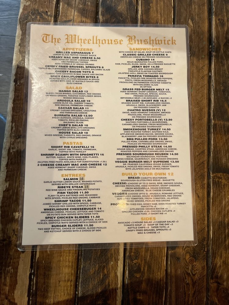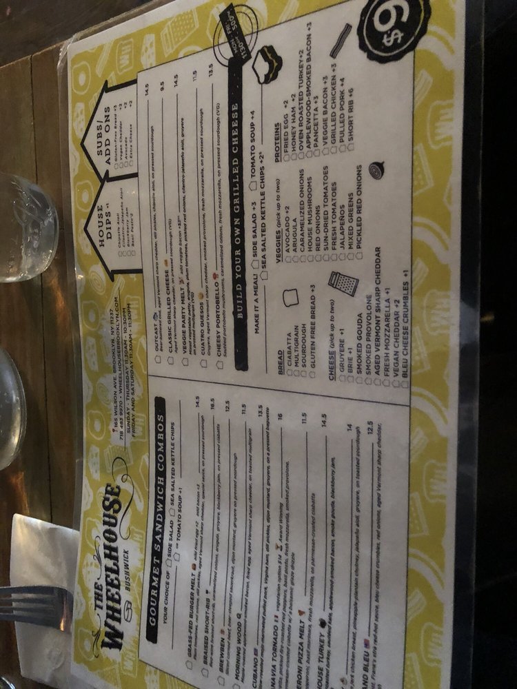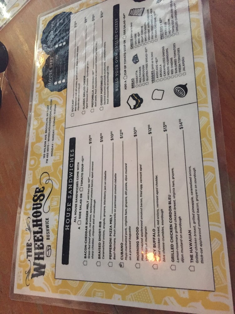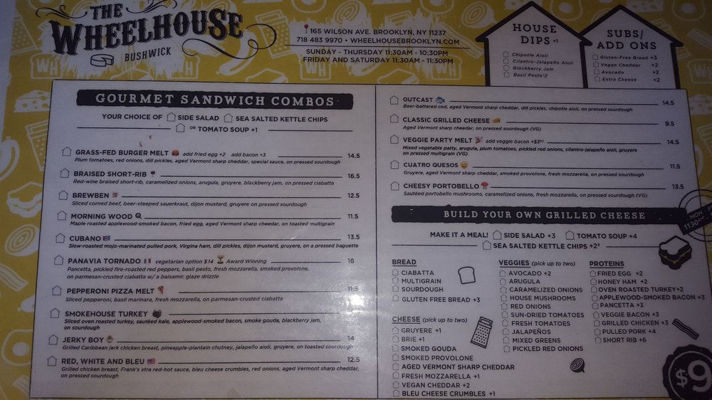 Introducing The Wheelhouse, a cozy bar in Brooklyn known for its New American cuisine and mouth-watering sandwiches. With options for vegans and vegetarians, The Wheelhouse offers a diverse menu that caters to every palate. The Gruyère and Sourdough grilled cheese is a fan favorite, paired perfectly with their tomato soup. The Jerky Boy Sandwich is also a must-try, with just the right amount of spice and flavorful chutney. Customers rave about the attentive service and delicious food, making every visit a special experience. Whether you're in the mood for brunch, lunch, or dinner, The Wheelhouse has something for everyone. Visit this hidden gem for a memorable dining experience in a casual, hipster setting.